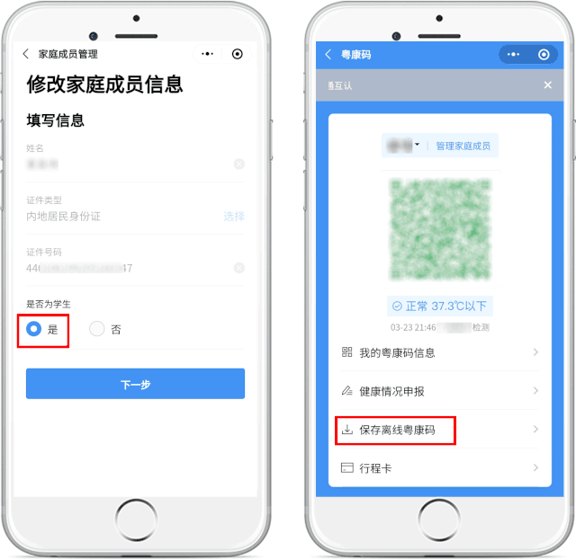 如果家庭成员标为学生,可保存离线粤康码,方便学生用户提供粤康码进行核验。