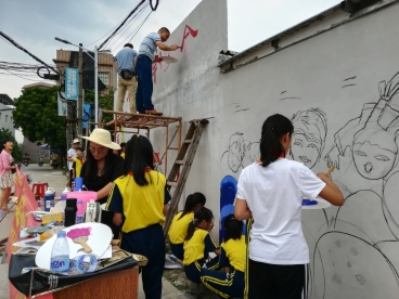 师生共同进行墙绘活动。