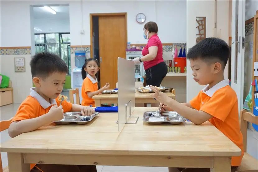 进入幼儿园后,孩子们回到课室开始吃早餐,为做好防控,园方准备了透明隔板安放在餐桌上,小朋友们按照贴好的标识入座就餐。许多小朋友回到幼儿园显得特别高兴,就餐后在班级里自在地玩起玩具。