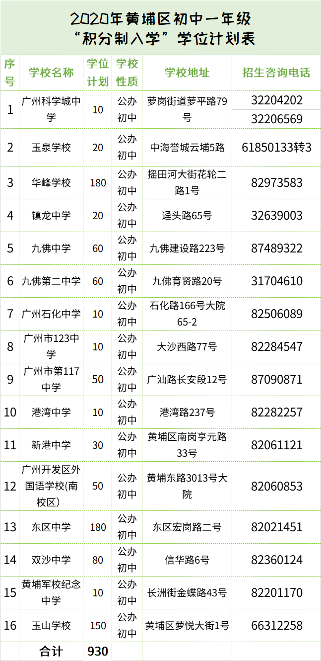 2020年黄埔区来穗人员随迁子女积分制入学学位分配实施办法及学位计划公布!今年共提供小学一年级学位1525个、初中一年级学位930个。