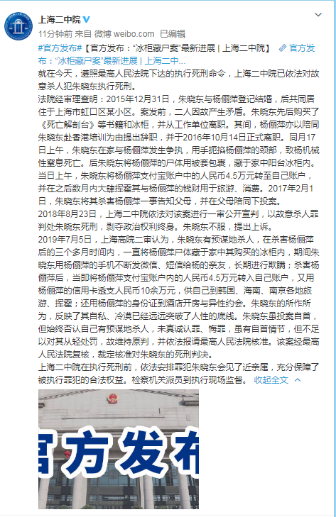 据@上海二中院 消息:就在今天,遵照最高人民法院下达的执行死刑命令,上海二中院已依法对故意杀人犯朱晓东执行死刑。