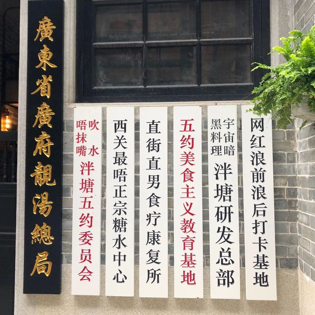 小荔昨日来到泮塘五约直街,看到这个店面位于该街的中间,上面挂着“广东省广府靓汤总局”的招牌,旁边又挂了6个副招牌,分别是“网红浪前浪后打卡基地”“宇宙暗黑料理泮塘研发总部”“五约美食主义教育基地”“直街直男食疗康复所”“西关最唔正宗糖水中心”“吹水唔抹嘴泮塘五约委员会”。