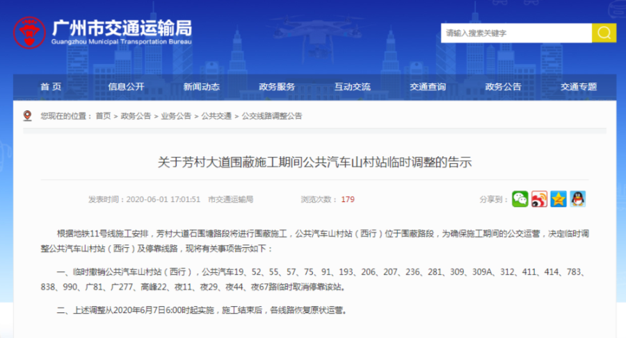 根据地铁11号线施工安排,芳村大道石围塘路段将进行围蔽施工,公共汽车山村站(西行)位于围蔽路段,为确保施工期间的公交运营,决定临时调整公共汽车山村站(西行)及停靠线路,现将有关事项告示如下: 一、临时撤销公共汽车山村站(西行),公共汽车19、52、55、57、75、91、193、206、207、236、281、309、309A、312、411、414、783、838、990、广81、广277、高峰22、夜11、夜29、夜44、夜67路临时取消停靠该站。 二、上述调整从2020年6月7日6:00起实施,施工结束后,各线路恢复原状运营。