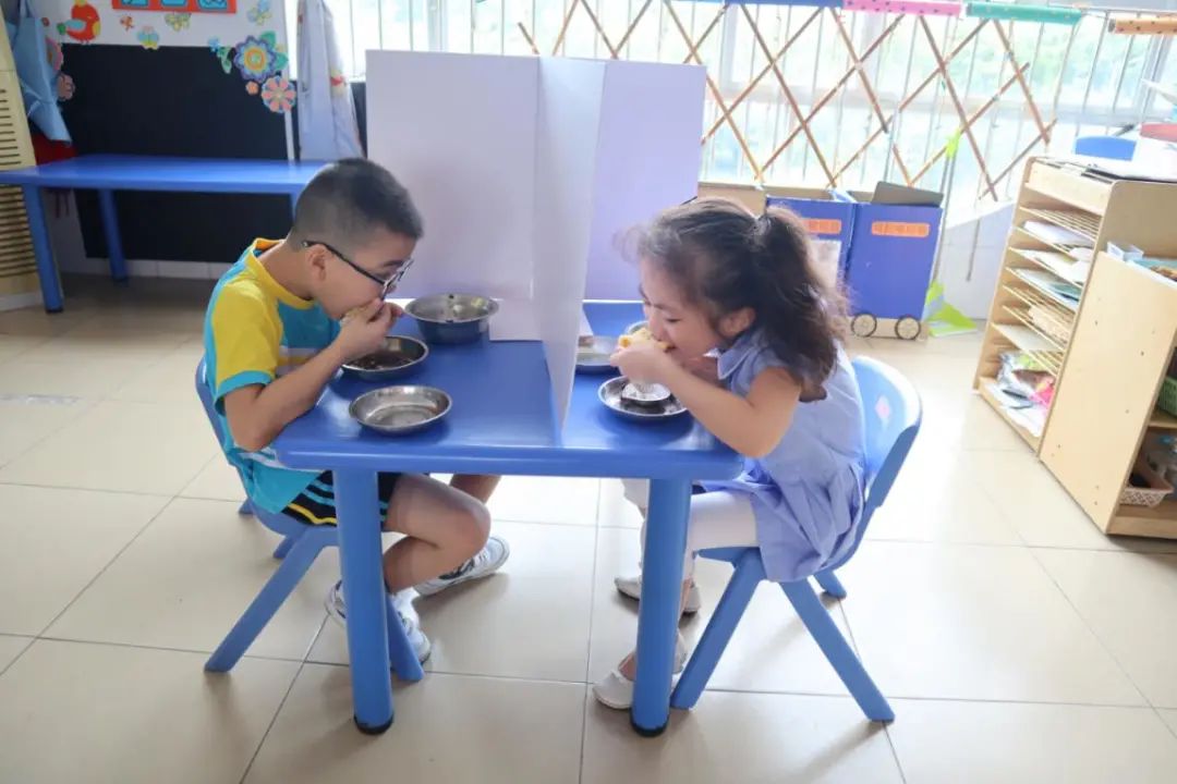 此外,幼儿们午睡时需要隔开一个床位;就餐时需要按照座位上的名字对号入座,4人一桌,中间放着间隔板,以减少接触。