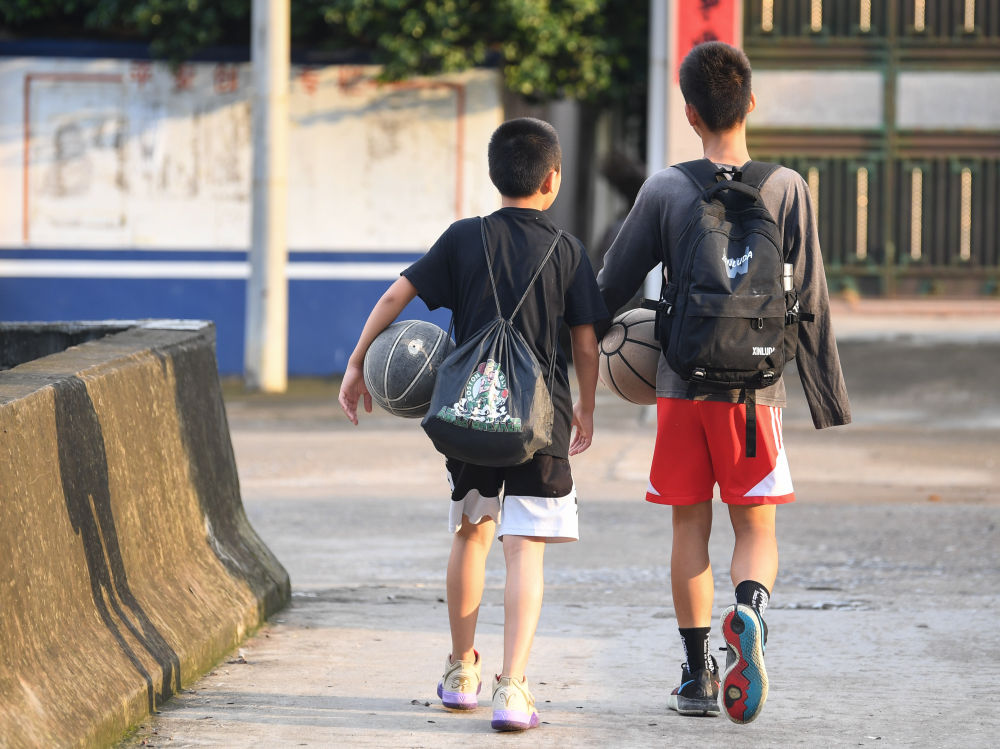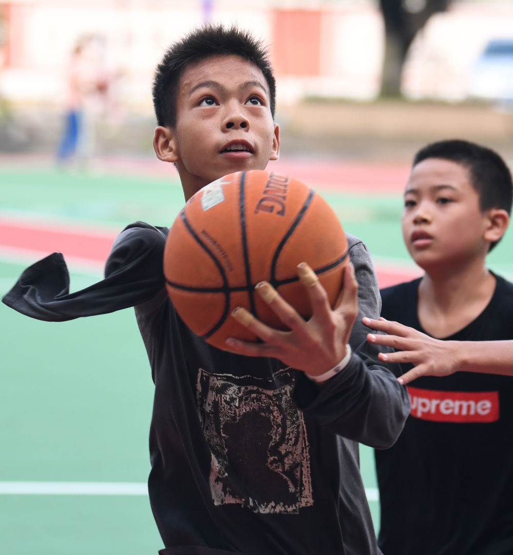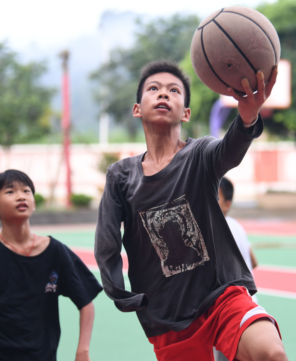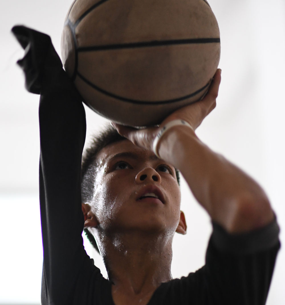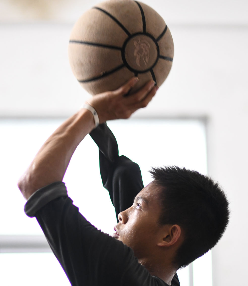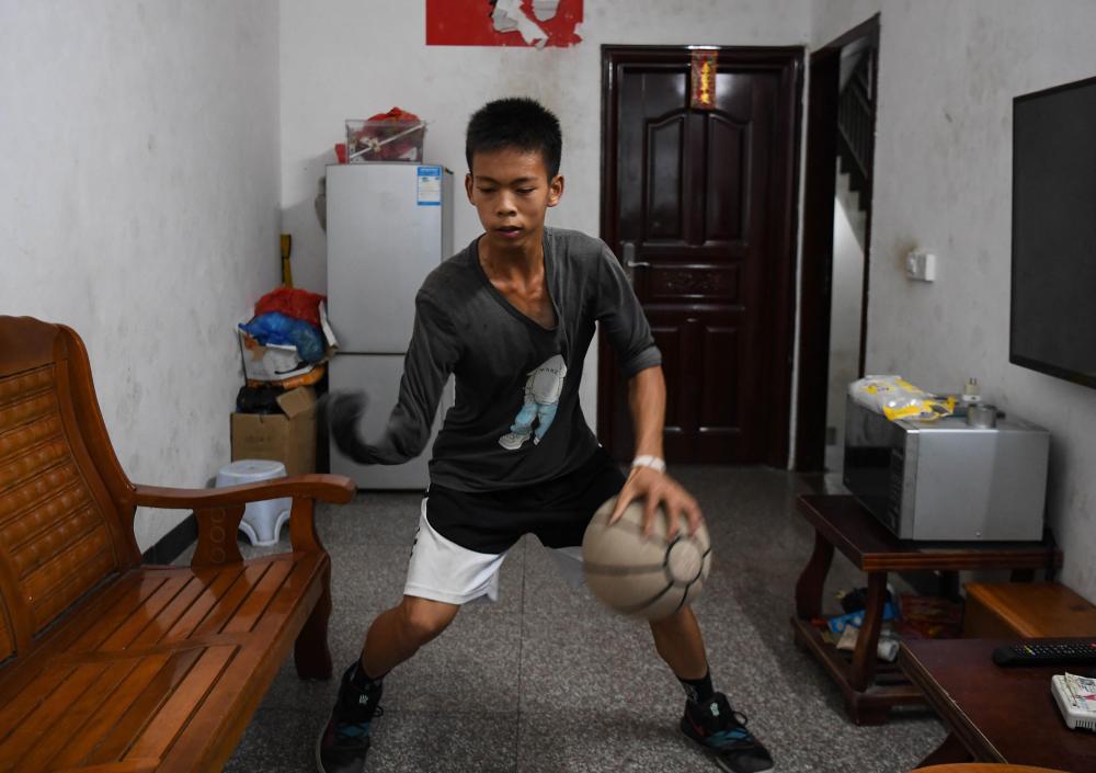 ↑图为6月3日,张家城放学后在家中房间练习投篮动作。新华社记者 邓华 摄
