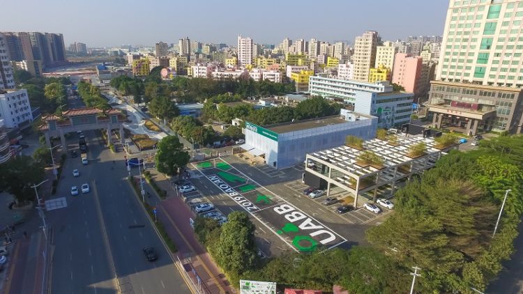 一条因为城市化飞速发展而消亡的“河涌”成了唤起这方水土相关独特记忆的景观《酷山水——地表的记忆》,这一景观装置作品将永久保留在宝安桥头的村口。雨季来了,这里又成了名副其实的河道,孩子们在这里戏水玩耍,老人在这里散步闲谈。斑驳陆离的青苔装饰着河道,关于“河”的记忆又重新回到了现实。而曾经掩映在花草树木中的社区公园和停车场,经过改造,现在也成了社区居民跳广场舞与亲子活动的去处。
