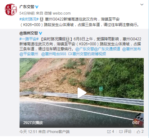 截止到15:03分的最新消息是,广惠高速已在沿线情报板发布提示信息,往广州方向车辆可提前在小金口站出,经国道行驶至龙溪站上高速;往惠州方向车辆可提前在龙溪站出,经国道行驶至小金口站上高速。路政、养护、交警等人员均已在现场紧急抢险,疏导交通,往广州方向路段预计可在1小时内抢通,往惠州方向路段预计可在3小时后抢通。