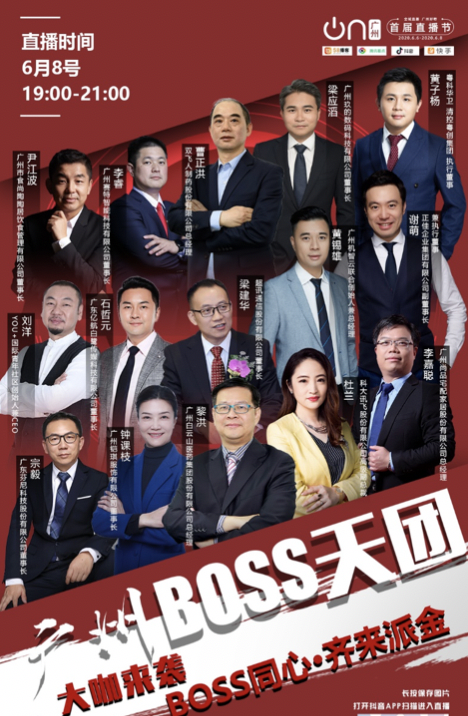 6月6日~6月8日举行的广州首届直播节,是全国首个以城市为平台的直播带货节,预计3天的直播场次将超过20万场。而在这20万场的直播中最特别的当属由广州创新企业联盟主办,广州人工智能产业协会协办的“BOSS天团特别场”。值得留意是,来自科大讯飞、广州白云山医药集团、铠琪服饰、尚品宅配等15位企业领军人物将组成“BOSS带货天团”直播卖货。