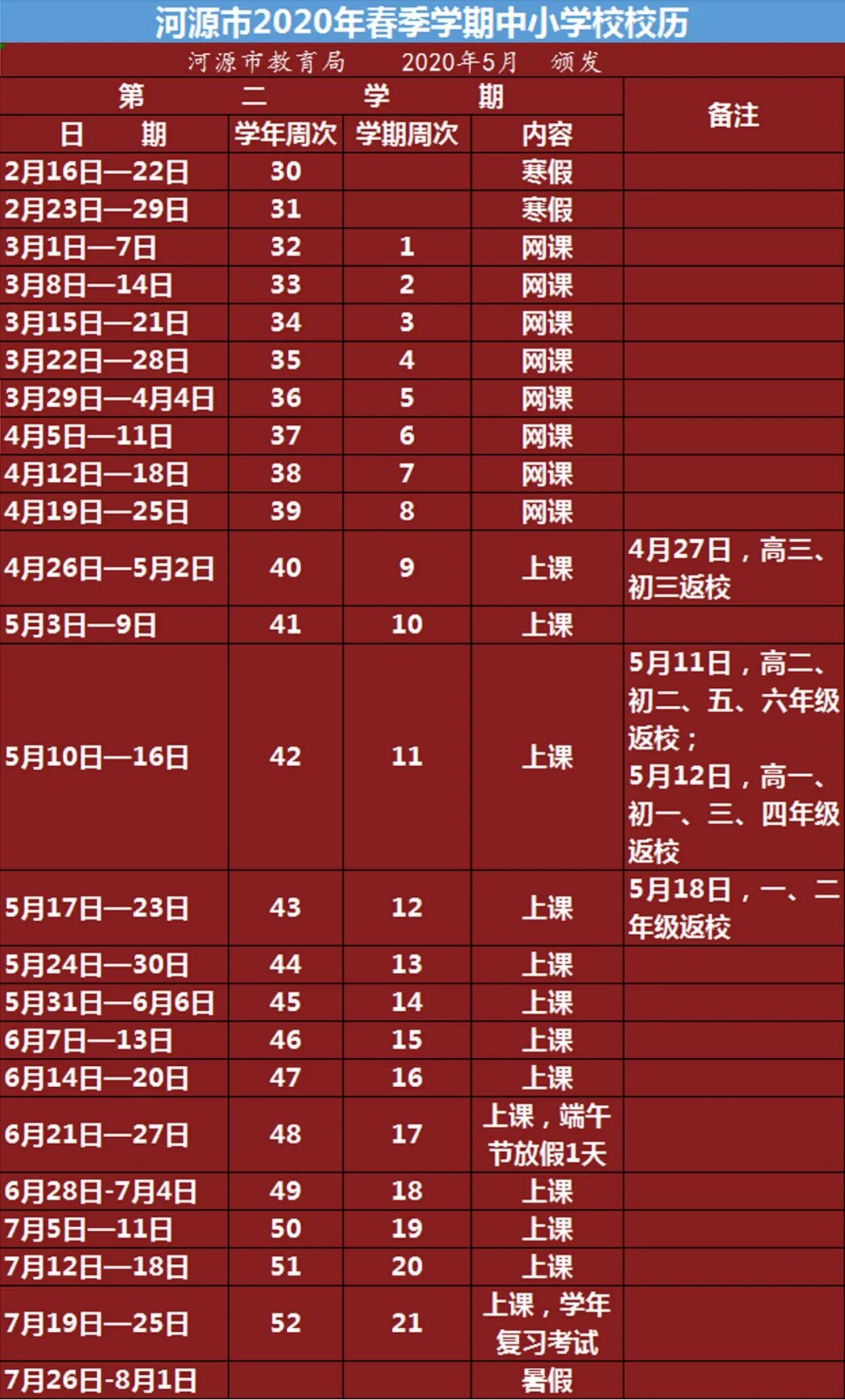 据广东省河源市教育局发布的《关于调整河源市中小学2020年春季学期校历的通知》,河源市义务教育阶段学校、普通高中学校2020年春季学期暑假开始时间均为7月26日,2021年高三应届毕业生如无特殊情况,按规定于8月1日返校开学上课。也就是说,部分学生的暑假只有6天。