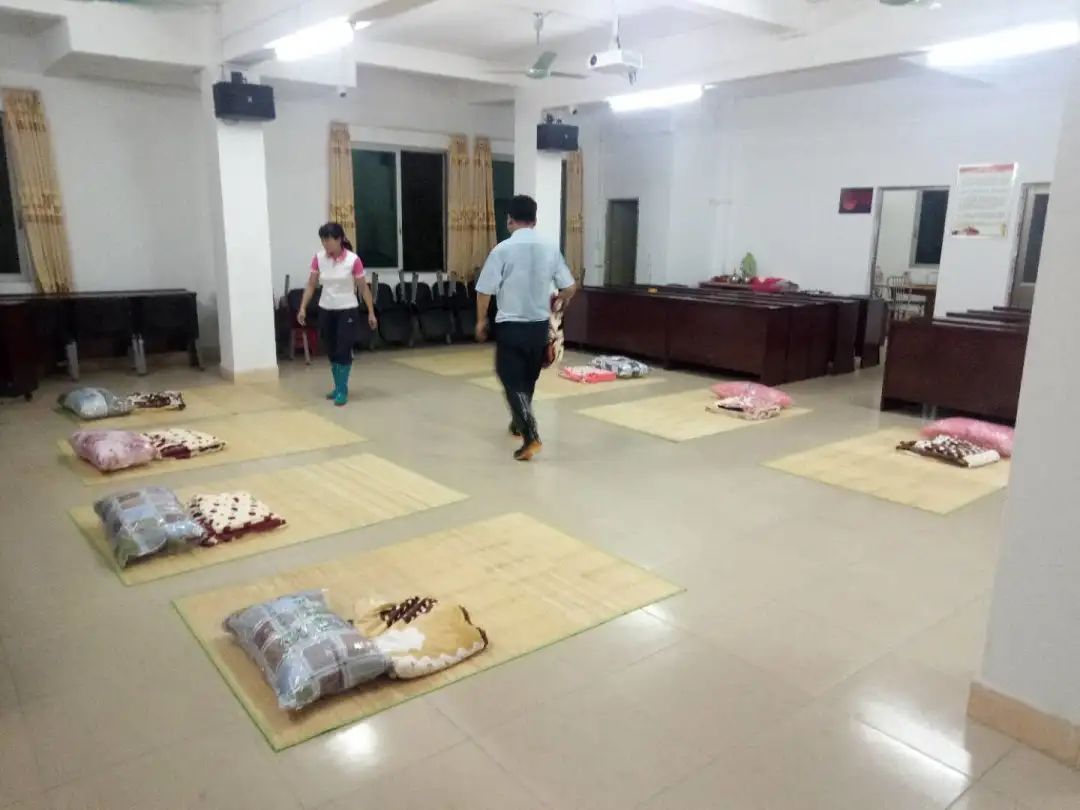 ▲居委干部在为群众铺设竹席、被单等物品,以便被转移群众能有个好的休息环境,并确保热水、干粮等物资供应,让群众安心在居委住下