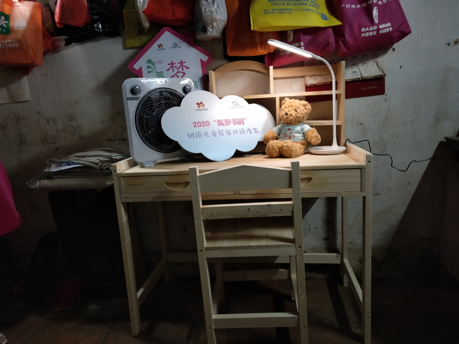 其实,像小玲、小威这样的儿童还有很多,他们大部分来自困难家庭,父母一方患病离世或残疾,家庭经济非常困难。2020年1月到5月,广州市增城区民政局购买的“农村留守儿童关爱保护和困境儿童保障工作项目”联合广州市中新镇社工服务站,对辖区内的398名困境儿童进行实地入户探访。探访中发现部分困境儿童家庭居家环境及生活设施较差,没有专门读书写字的桌子,基本都是把饭桌当作书桌用,同时照明不足,不利于学习和健康。
