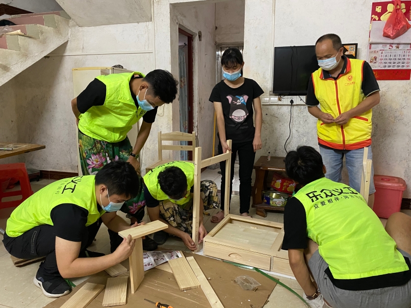6月9日,尽管倾盆大雨,但一群热心的志愿者还是如约来到困境儿童的家里,他们中有的是亲子家庭、有的是有木匠经验的资深志愿者、还有的是来自专注艺术空间创作工作室的成员。