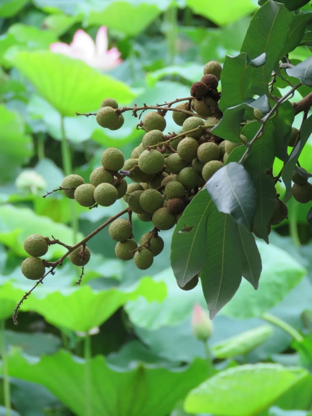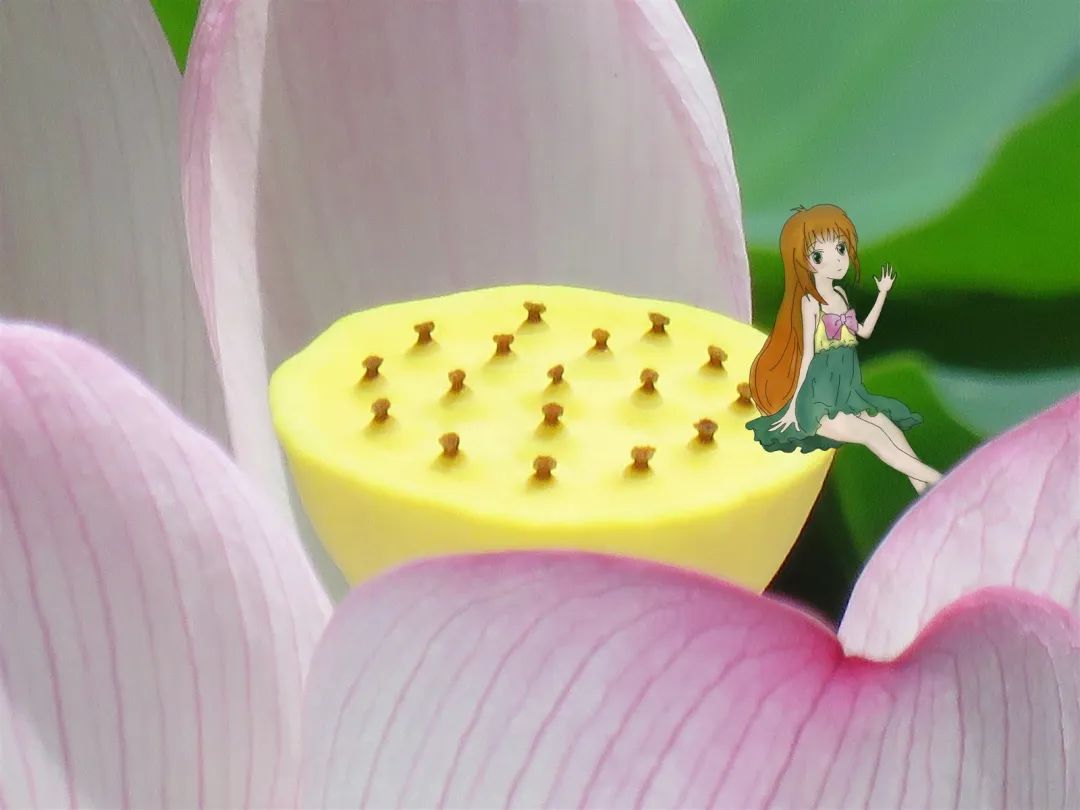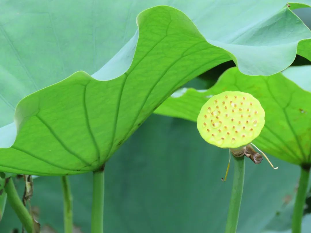 金黄色的莲蓬像一块软糯的绿豆糕,褪去了花蕊和花瓣的层层保护后,顶着光秃秃的脑袋静静生长,等待莲子一个个发育饱满,收获的季节也就要到来,岸边应季的荔枝、龙眼、黄皮也就成熟了!