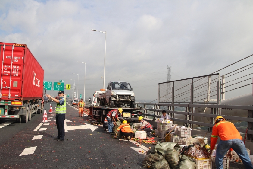 由于事故发生时赶上车流早高峰,南沙大桥路政在车流中疏通了一条救援道路,方便救护车、拯救车等救援车辆到达。经过现场了解,货车上装载了大约1000公斤西瓜、桃子等水果,价值1万余元,计划从沙田运往南沙销售,车辆因爆胎侧翻,货车司机胳膊轻微擦伤。由于碎裂的西瓜占地面积大,各方共投入6台救援车辆,20余人参加救援,路政部门封闭单向全部车道,并协助养护、拯救清理路面,医护人员为司机包扎了伤口。仅用时10分钟,散落在车道内的货物就清理完毕,左侧3条车道顺利解封。