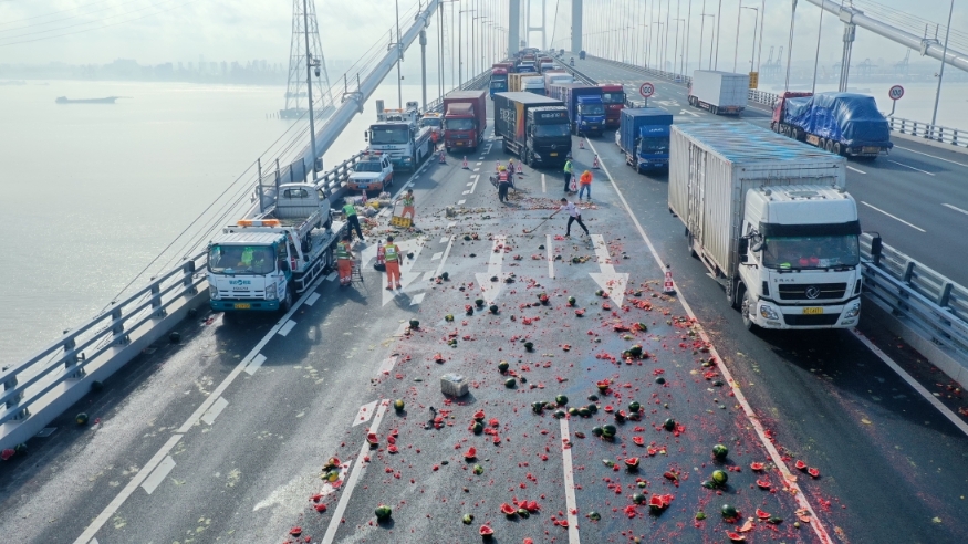 6月10日早上7时40分,南环监控巡查路面时,发现南沙大桥西行东莞往广州方向一台小货车侧翻,大量破碎的西瓜铺满桥面,现场交通出现拥堵,过往车辆纷纷避让。情况紧急,南环段分公司及时启动保畅应急预案,通知交警、路政等相关部门前往处理。