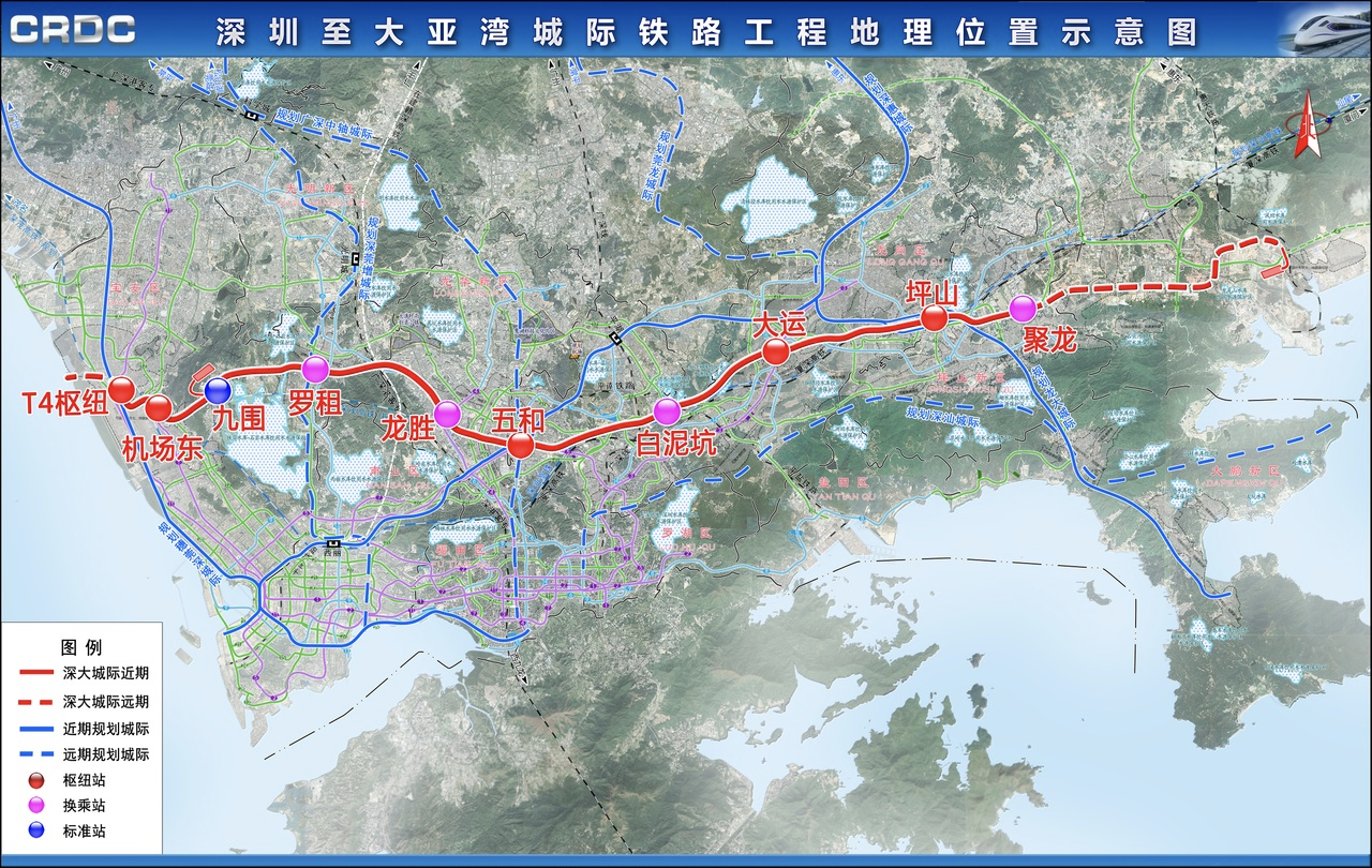 深圳市城市交通规划设计研究中心受中国铁路设计集团有限公司委托,开展深圳至大亚湾城际(以下简称“深大城际”)铁路工程可行性研究社会稳定分析专题研究。根据其发布的公示信息,深大城际铁路规划自宝安机场T4站至惠州大亚湾经济技术开发区,途经宝安区、龙华区、龙岗区、坪山区、惠州市大亚湾地区,其中深圳段为近期实施工程,惠州段为远期预留工程。