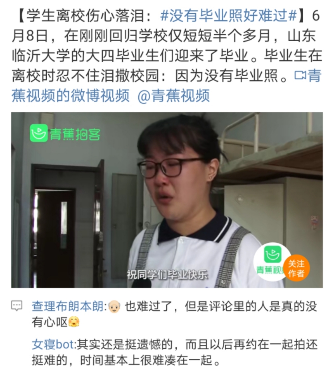 说来也是辛酸,近日,又有一个新闻上了热搜。6月8日,刚刚返校不到一个月的山东临沂大学大四毕业生迎来毕业。毕业生在离校时不禁泪洒校园,称没有毕业照好难过。