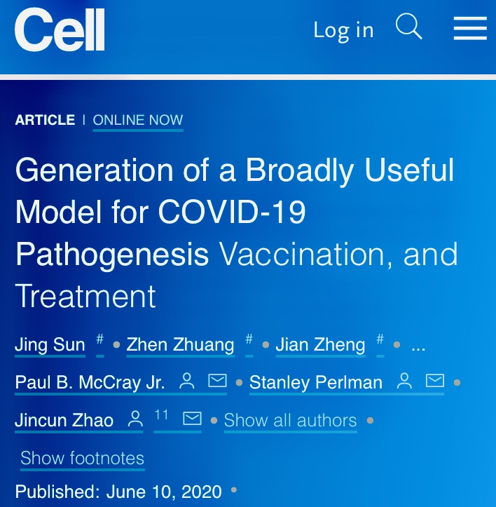 据呼吸疾病国家重点实验室消息,6月10日,在钟南山院士指导下,广州医科大学附属第一医院/呼吸疾病国家重点实验室赵金存教授团队与广州海关技术中心国家生物安全检测重点实验室(P3实验室)、美国爱荷华大学、广州再生医学与健康广东省实验室、中国科学院广州生物医药与健康研究院等团队合作,在Cell杂志在线发表了题为Generation of a Broadly Useful Model for COVID-19 Pathogenesis Vaccination, and Treatment的研究成果,应用表达新冠病毒受体人ACE2的腺病毒转导小鼠,快速建立首个新冠肺炎非转基因小鼠模型,此动物模型可应用于新冠肺炎治疗药物效果评价、疫苗效果测试及致病机制等多方面研究。