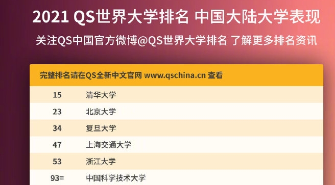 10日,QS世界大学排名发布榜单,清华、复旦、上海交大三所内地高校获得了在该排行榜上的历史最高排位。其中清华从世界第16名上升到第15名,亚洲排名第三。中国内地共有6所高校进入世界前100。此次排名,英美大学集体下滑,美国153所参与本次排名的大学中有112所排名下降,在84所排名最高的英国院校中,有62所的排名逐年下降。详情>>>