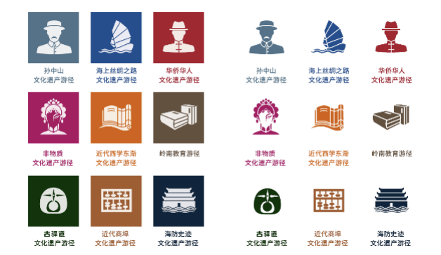 粤港澳大湾区因海而生,与海共荣,广州历史悠久的市舶制是广东省粤港澳大湾区文化遗产游径标志设计的概念来源。标志背后的三个方格框,喻意粤港澳三地,表现形式是模仿古本的方格,暗示文化历史。前面的三条弯线也是三地的意思,也指海浪、路径,通过三线的流动,联系起了三地,贯穿了地理历史文化。每条主题游径还设置了专门的颜色和标识图形以便区分。在标识设计的基础上,以信息柱为载体,通过搭载不同层级的增量信息,进一步增强了游径的可读性和故事性。