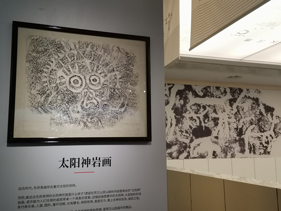 展览中的重点展品之一是太阳神形象的岩画拓片。馆方专家介绍,远古时代,先民普遍存在着对太阳的崇拜。然而,被远古先民崇拜的太阳神是什么样子呢?贺兰山岩画中,太阳神岩画作为最具代表性的岩画之一,神采奕奕的面容反映了远古先民自然崇拜、天体崇拜的原始思想。
