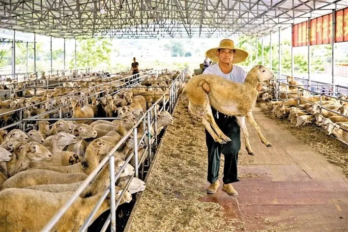 △在都安县地苏镇的澳寒羊拉棠场养殖基地,养殖人员高兴地抱起一头羊。(摄影:刘安邦)