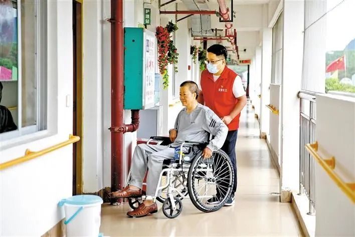 △大化县民政事业园,宝安社工王道俊帮助行动不便的老人。(摄影:刘安邦)