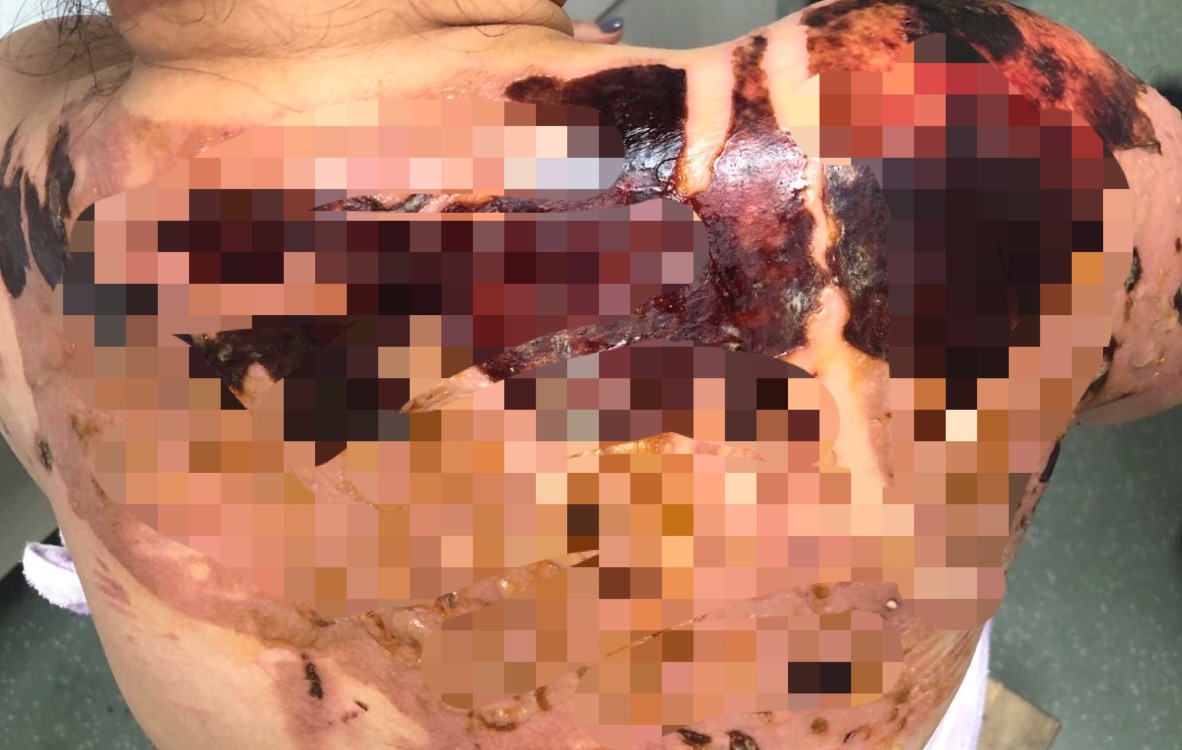 当天晚上9时多,梁女士回到家后开始觉得后背很痛,便告诉了母亲,母亲帮她脱衣服的时候不小心撕脱了水泡,然后按照老家的习惯给她处理——首先往烫伤的创面上撒盐,紧接着用高浓度的白酒冲洗水泡破裂的裸露创面消毒,然后使用清洗蔬菜水果的洗洁精清洗烫伤的创面。在此番连续操作下,梁女士痛得昏了过去。慌了神的外婆赶紧打电话给梁女士的儿子,梁女士这才被儿子紧急送入医院进行救治,终于捡回一命。