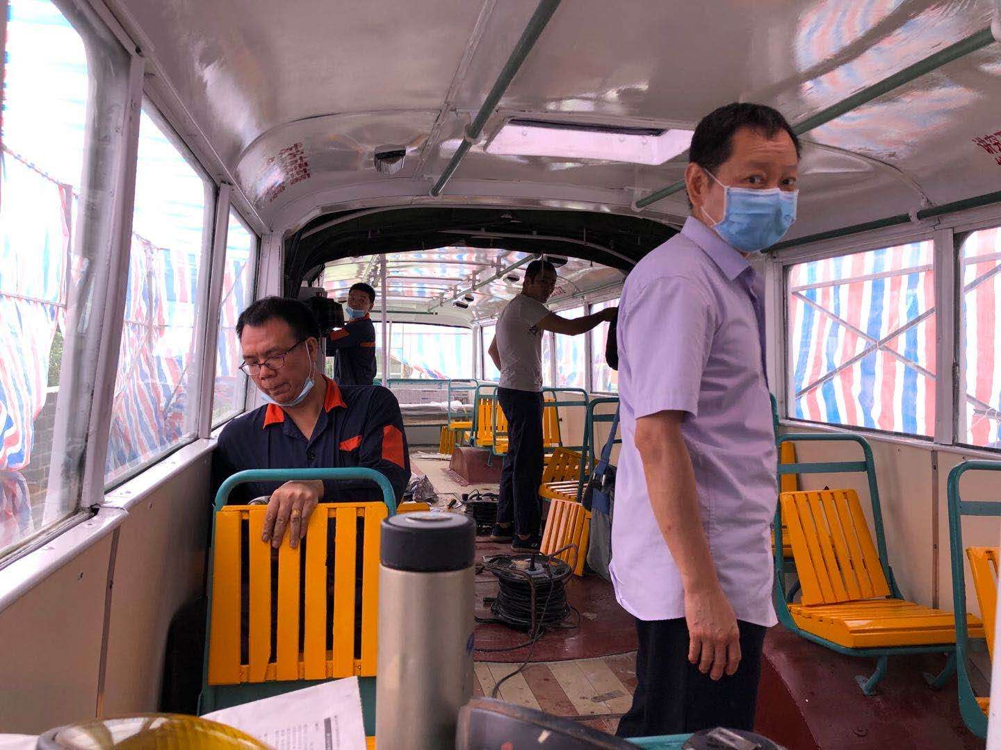 廣州日報記者了解到,得知「古董」無軌電車身體健康告急,電車公司立即成立拯救小分隊,由修理廠生產調度主任孔祥瑞擔任隊長,帶領多工種技術骨幹開展「古董」無軌電車健康拯救大行動。為咗確保「古董」無軌電車嘅拯救工程如期完成,喺氣溫高達35℃嘅日子裏,電車公司團隊加班加點。電車被放置喺鎮海樓旁邊嘅城牆上,由於唔可以隨意移動位置,所以團隊只能喺原地露天施工。