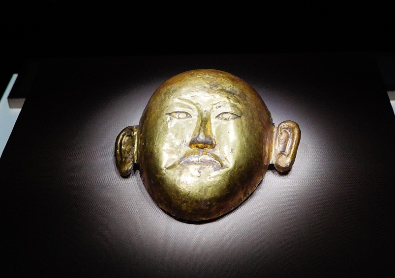 丧葬用面具,出土时覆盖于陈国公主面部。整体用薄金片锤击成形。面具制作精细,周边有33个穿孔,用细银丝沿着穿孔将其与头部网络连缀起来。
