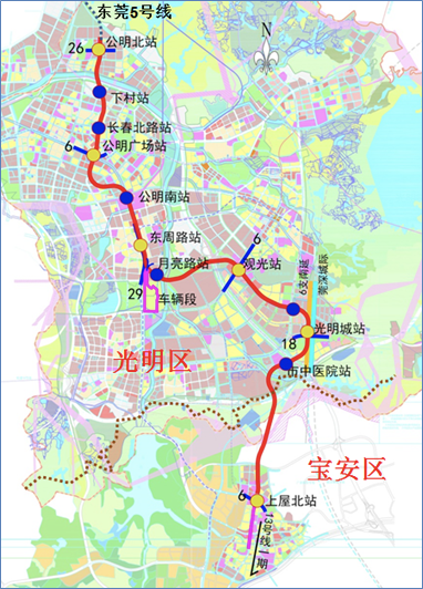 地铁 13 号线二期工程(北延)线路起于一期工程上屋北站 (不含),沿田心路敷设穿越大眼山后主要沿鹅颈西路—长圳路—茶林路—观 光路—东明大道—塘宏路--松白路—长春路—炮台路敷设,止于公明北站,线 路全长约 19.296km,共设站 11 座。设车辆段一座,不新建主所(利用 6 号线 在建光明主所及一期在建罗租主所),控制中心设置于深圳 NOCC 内。