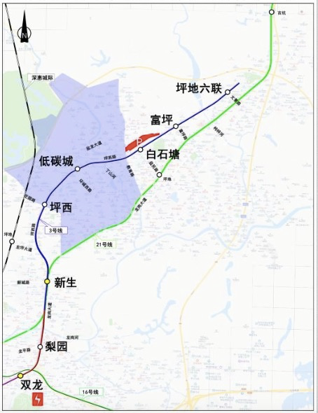 地铁3 号线四期工程由3 号线已运营的双龙站引出,上跨双龙立交,折向龙岗大道路中高架敷设;在规划龙平路交叉口设置梨园站;上跨龙岗河后,在新城路交叉口设置新生站, 与规划 21 号线换乘;出站后,线路局部下穿地块、规划龙坪大道,转入坪西路,沿坪西路向东北敷设;在花园路交叉口处设置坪西站,在环城路设置低碳城站;之后线路进入坪西路(吉祥路段),下穿丁山河后,继续向东敷设, 在益民路路口处设置白石塘站;出站后线路转入坪西路(振兴路段)向东敷设,在富坪路路口处设置富坪站,富坪站西侧接坪地停车场出入线;之后线路下穿杶梓河后,沿规划坪西路敷设,在文景路路口设置坪地六联站。3 号线四期工程线路全长约 9.28km,其中高架段长度为 1.43km,过渡段长度为 0.36km,地下段长度为 7.49km。共设车站 7 座,梨园站为高架站,其余为地下站。