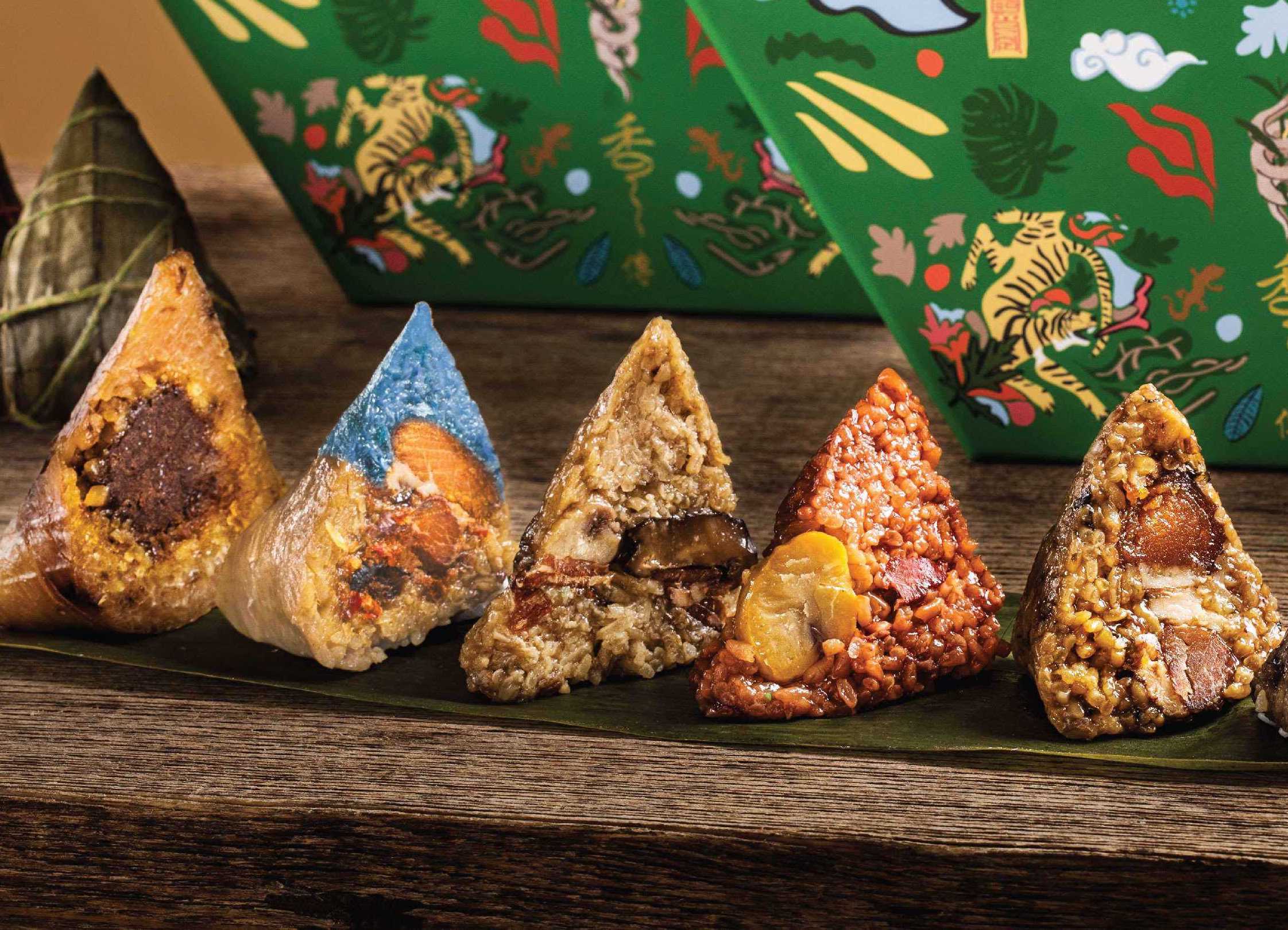 香格里拉集團嘅粽子則集八方風味,來自上海浦東嘉里大酒店嘅李銳明師傅、義烏香格里拉大酒店嘅陳曉春師傅、廣州香格里拉大酒店嘅陳國雄師傅、中國大飯店嘅陳堅師傅,將本土食材發揮到極致,分別喺粽子中加入江南特色南風鹹肉、金華特色兩頭烏火腿肉、粵式溏心鮑魚、潮汕海皇燒肉,風味十分特別;而來自深圳福田香格里拉大酒店嘅董玉振師傅則選用黑松露、鵝肝等西式食材,中西融匯,創製咗創新嘅蘇式肉粽;蘇州香格里拉大酒店嘅梁偉大師傅喺主原料嘅選用上打破常規,採用從椰樹木髓部提取嘅澱粉烘乾而成嘅西米,帶來果香濃郁嘅榴槤奶黃水晶粽;來自北京香格里拉大酒店嘅甘兆棠師傅和大連香格里拉大酒店嘅王志雄師傅則選擇唔同品種嘅海鮮入味,打造海味裹蒸粽及沁香臻粽禮盒(佛跳牆粽)。