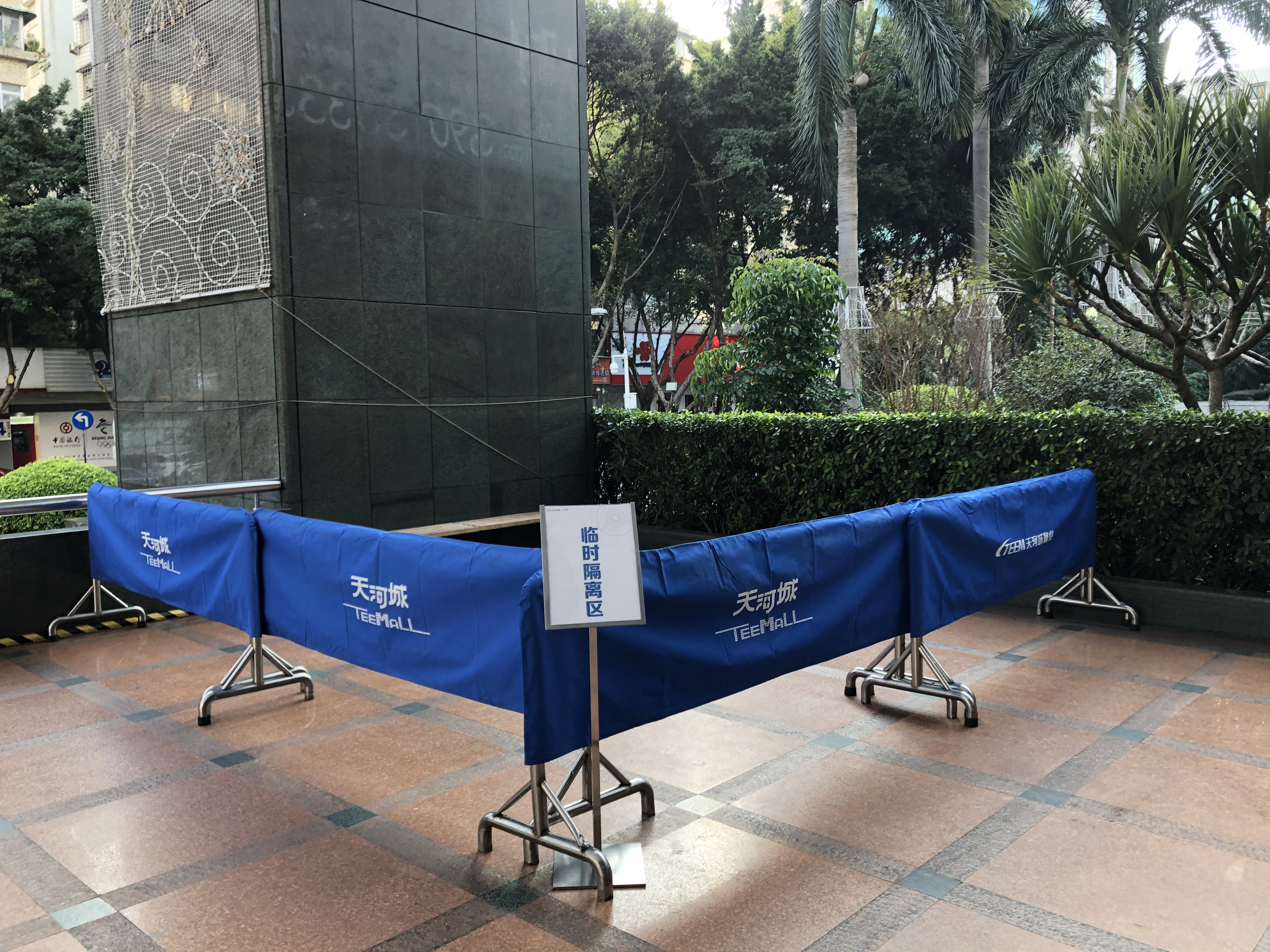 先来到天河城公共区域商场。在进门之前,记者首先看到商场外一个显眼的“临时隔离区”,工作人员正在全副武装地进行常规消毒杀菌工作,他告诉记者:“当发现疑似病状人员的时候,会有专人将其及时转移到这个区域进行暂时隔离,并按照相关流程上报处理。”