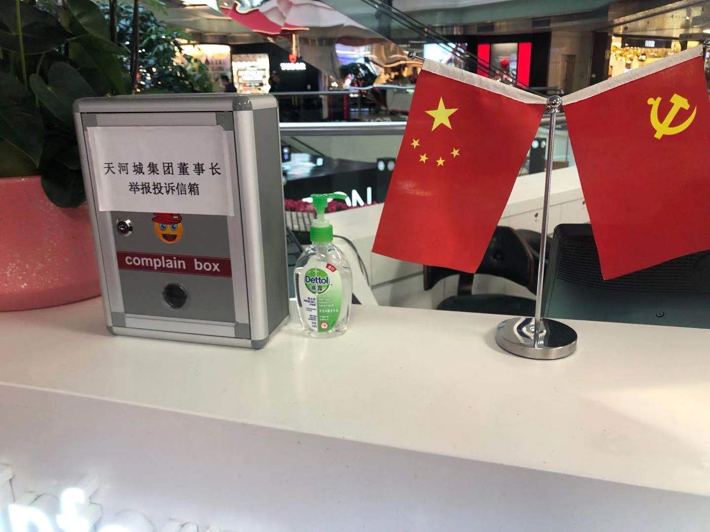 在天河城购物中心四大门入口处,都放着防疫宣传水牌。旁边有测温点,工作人员正在逐一对进入人员测量体温并做记录。手温枪显示体温正常,方可进入。