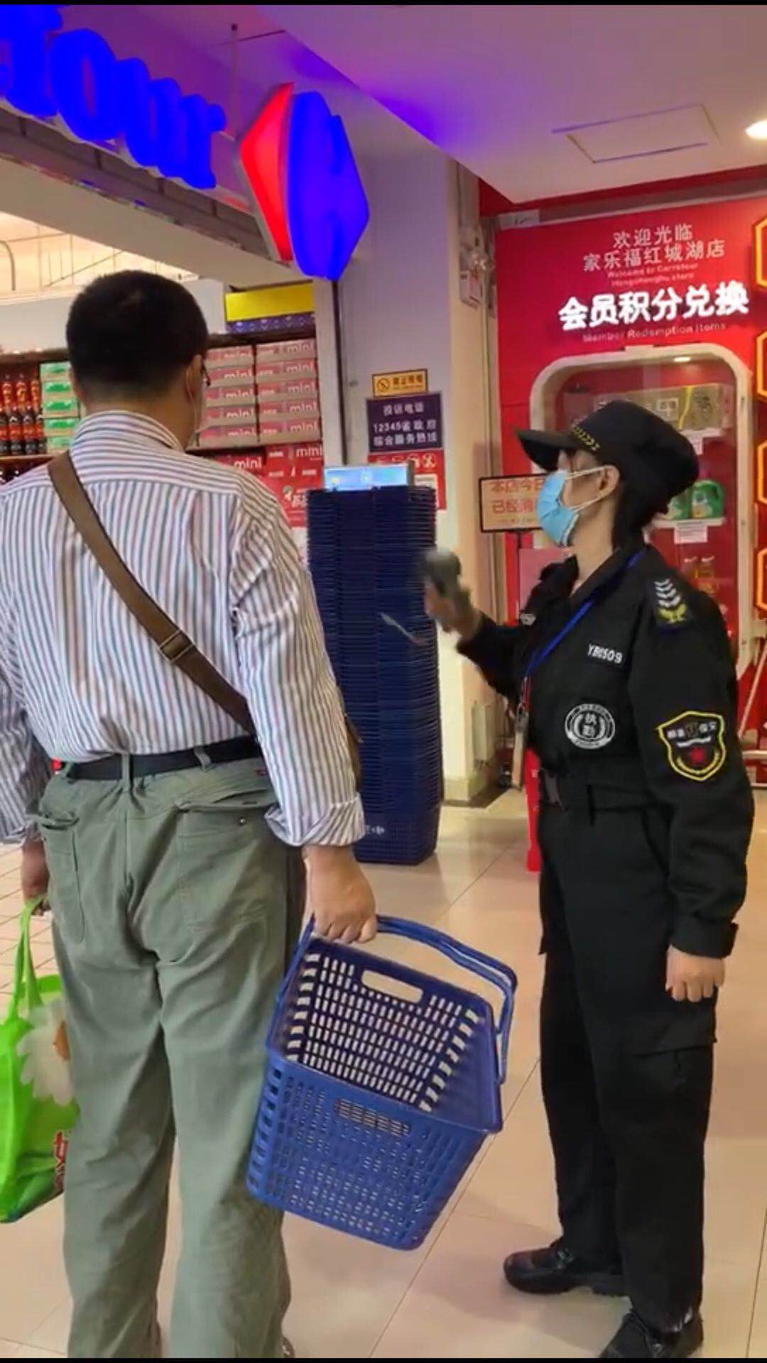 最后记者来到天河城负一楼的永旺超市。在出入口,记者第三次测量了体温,并且在工作人员指引下取了一辆完成全面消杀的购物车。