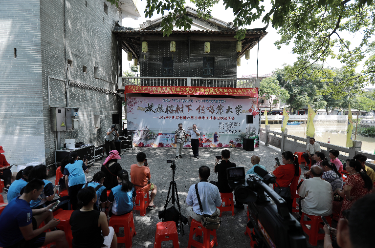6月13日的东涌咸水歌非遗开放日活动以歌友联谊的形式举行,暖阳晴空的河涌边榕树下,咸水歌声一起,东涌水乡风情街的濠涌亲水码头很快就有不少街坊邻居前来驻足围坐聆听。从佛山、中山、珠海等地赶来的咸水歌传承人和爱好者与东涌本地咸水歌友们轮番“斗歌”,或独唱、或对唱,引来街坊阵阵掌声。