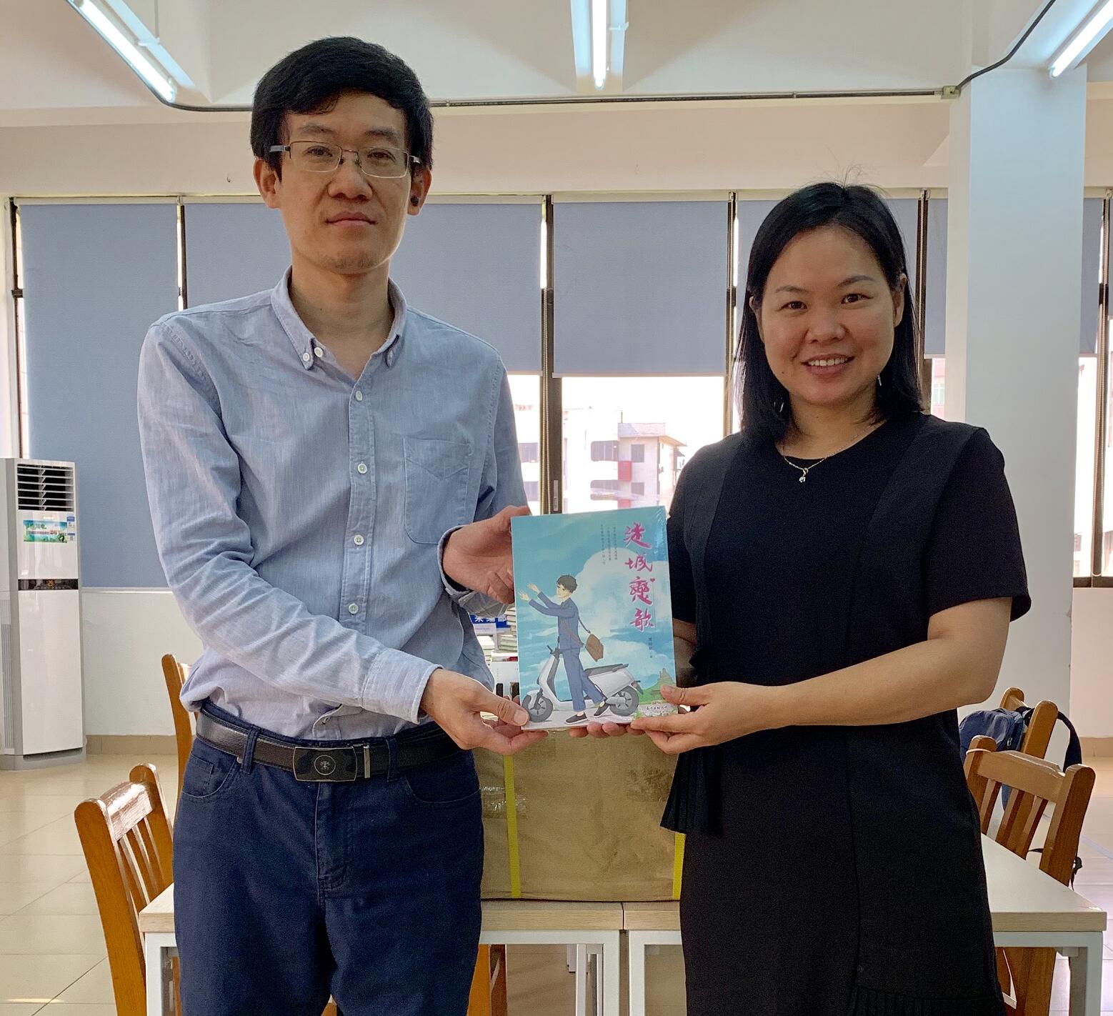《迷城恋歌》作者谭顺秋(左)近期向南海区图书馆赠送一批《迷城恋歌》新书。