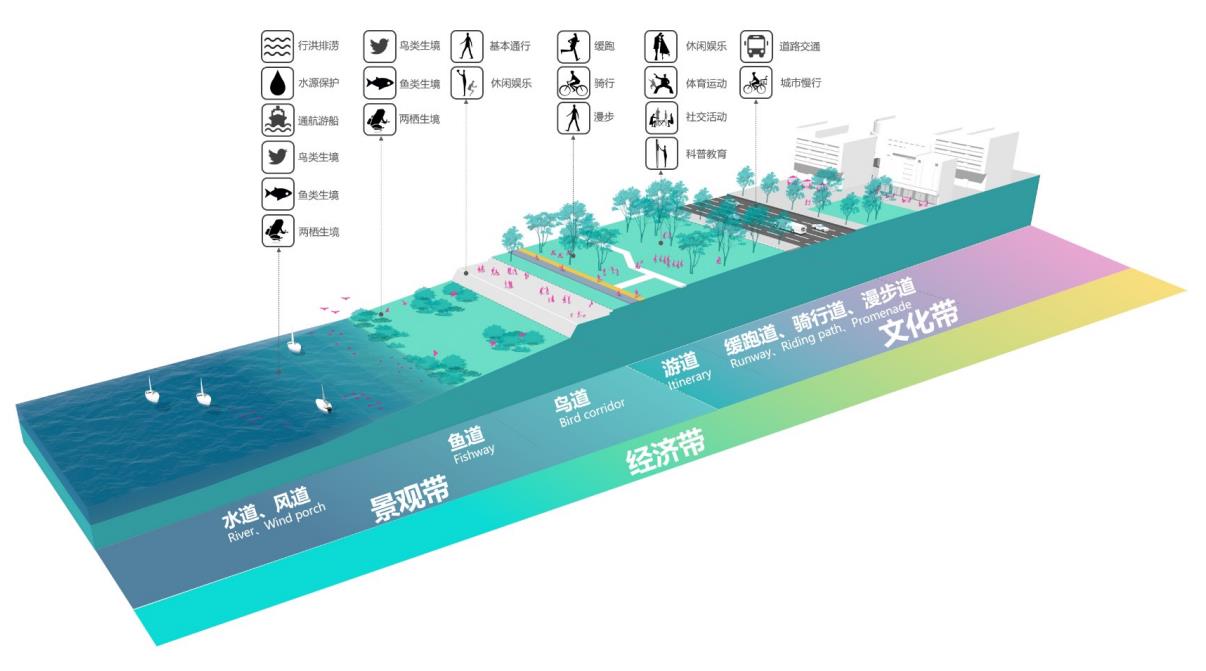功能复合是碧道的一大特色,规划中也提出,以碧道统筹山水林田湖海系统治理,改善流域生态环境、实现空间综合利用、带动产业转型升级、激活片区多元价值。广州市深化细化省万里碧道“三道一带”空间要求,提出“水道、风道、鱼道、鸟道、游道、漫步道、缓跑道、骑行道”八道合一和“滨水经济带、文化带、景观带”三带并行的“八道三带”空间范式,保护珠江生态岛链、建设碧道风廊、水鸟走廊,恢复鱼类洄游生态圈,打造蓝线上的公共服务综合带,实现堤内外、上下游、干支流、左右岸系统治理,形成广东碧道建设的“广州方案”。