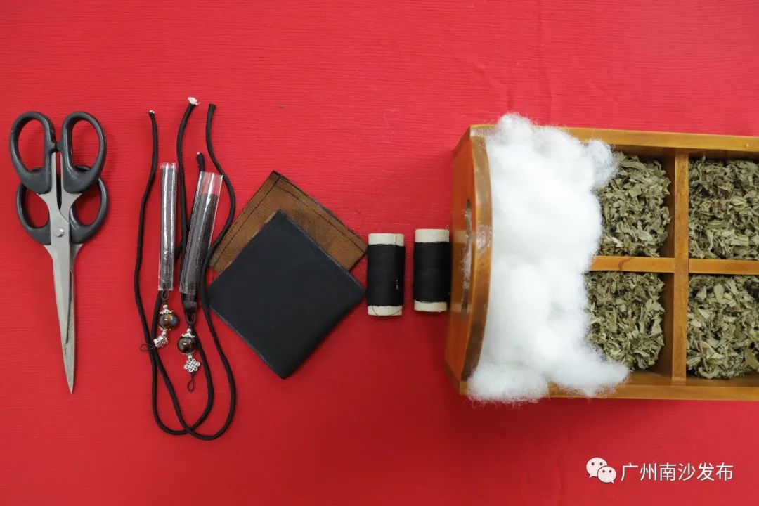 在活动大厅,工作人员已提前布置好将会用到的材料和工具。香云纱布料、棉花、艾叶、流苏、绳子,一把剪刀、一根针线就是制作香囊的全部工具。