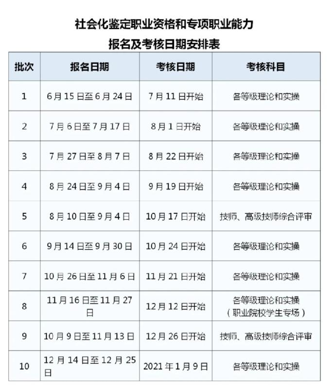 深圳社会化鉴定职业资格评价和专项职业能力考核的考核科目包括理论、实操及综合评审(各项目、等级报考科目详见相关职业考核大纲或专项职业能力考核规范)。本年度考核批次调整为10批,包括社会考生考核7批,职业院校学生专场1批,技师高级技师综合评审2批。最近一期报名已经启动,7月11日开始考核。