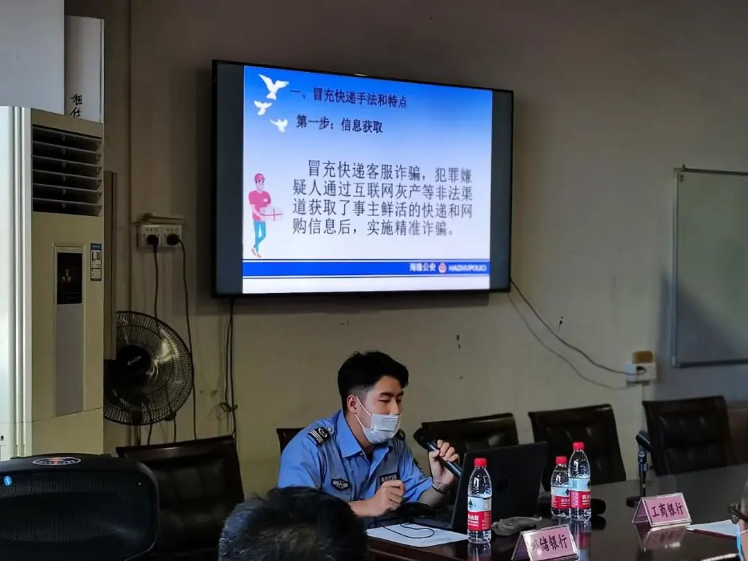接下来,南石头派出所副所长钟安和派出所的民警通过PPT及视频的方式向大家介绍了近期以来发生较多的诈骗类型和诈骗手法,包括快递诈骗、贷款诈骗等等。