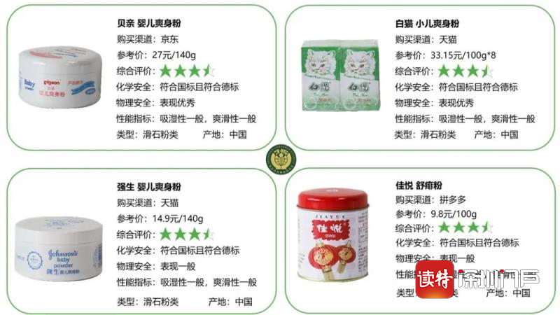 让不少父母对爽身粉的安全性存在担忧。婴儿爽身粉类产品种类也层出不穷,细分品类也越来越多,如滑石粉、玉米粉、松花粉等,使用效果大相径庭,消费者选择时眼花缭乱。为了解市面上婴儿爽身粉的安全性及使用性能,给消费者提供科学合理的消费指引,深圳市消费者委员会、福田区消费者委员会、宝安区消费者委员会委托深圳市品质消费研究院开展婴儿爽身粉比较试验。
