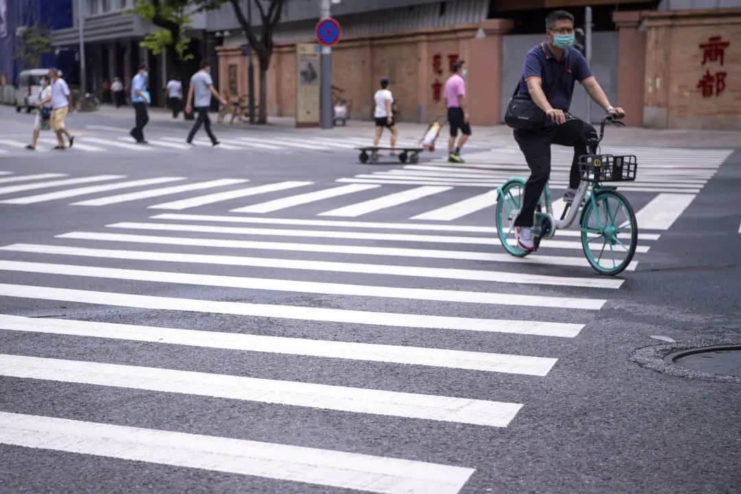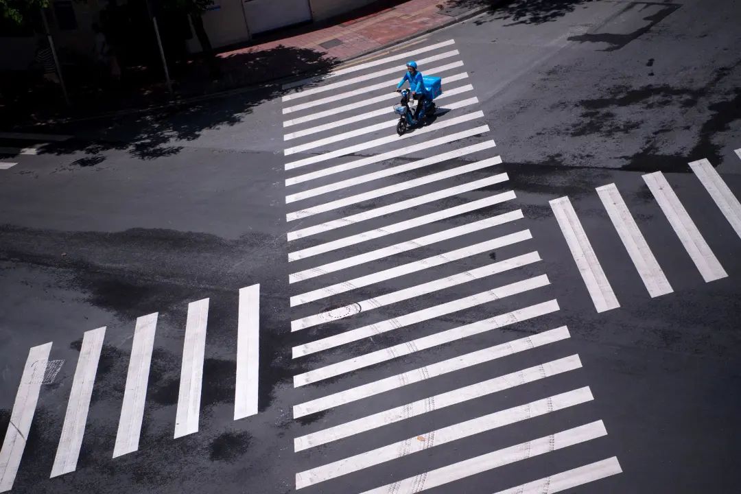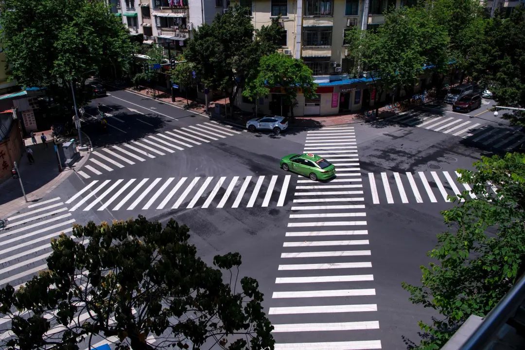 小e今日来到西湖路和教育路交界,看到这条对角斑马线,就是在路口原本的四条斑马线中间加了两条交叉的斜线。从高处往下看,犹如一个大写的“X”。