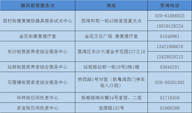 据了解,目前荔湾区有这些地方提供辅具租赁服务,有需要的街坊可以就近前往了解或拨打电话进行咨询~
