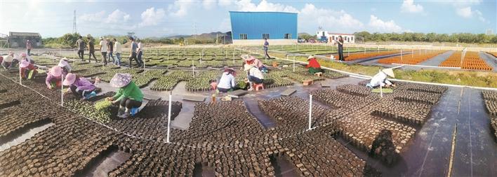 “公司+农户”是前海探索出的产业化扶贫发展模式。前海每年有大量时花苗木需求,八社区有种植时花的优越条件。2018年,前海管理局创新产业扶贫思路,以虚拟收益分红(不用实际出资而享受分红)、苗木种植回购及劳务就业支持等产业扶持形式,帮扶八社区。2018年7月,扶贫工作队通过招商引资,吸引深圳公司落户侨区,投资200万元,兴建前海扶贫产业苗圃基地,承接前海时花生产订单,当年达到全省同行业一流生产标准。2019年,基地完成前海130万元时花订单。