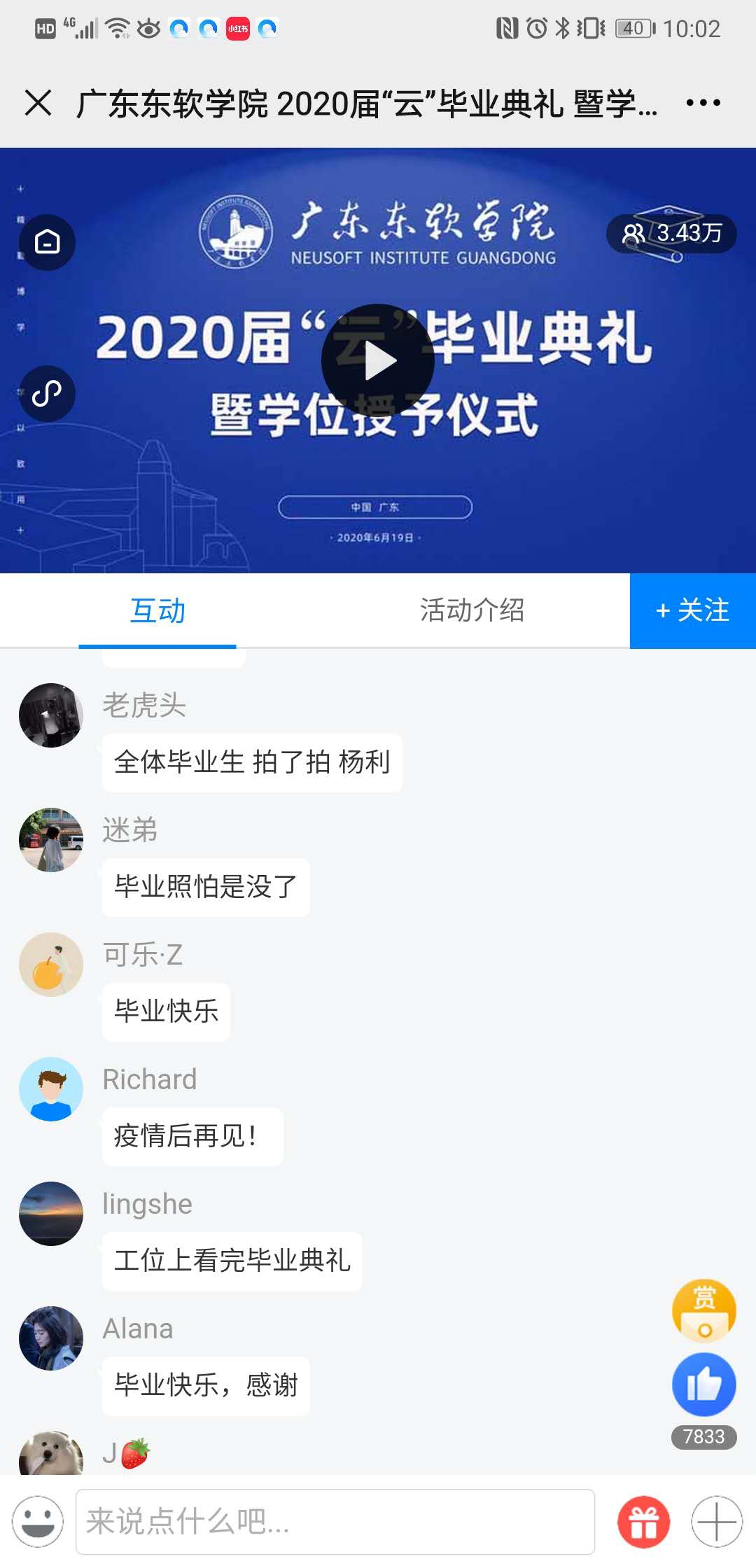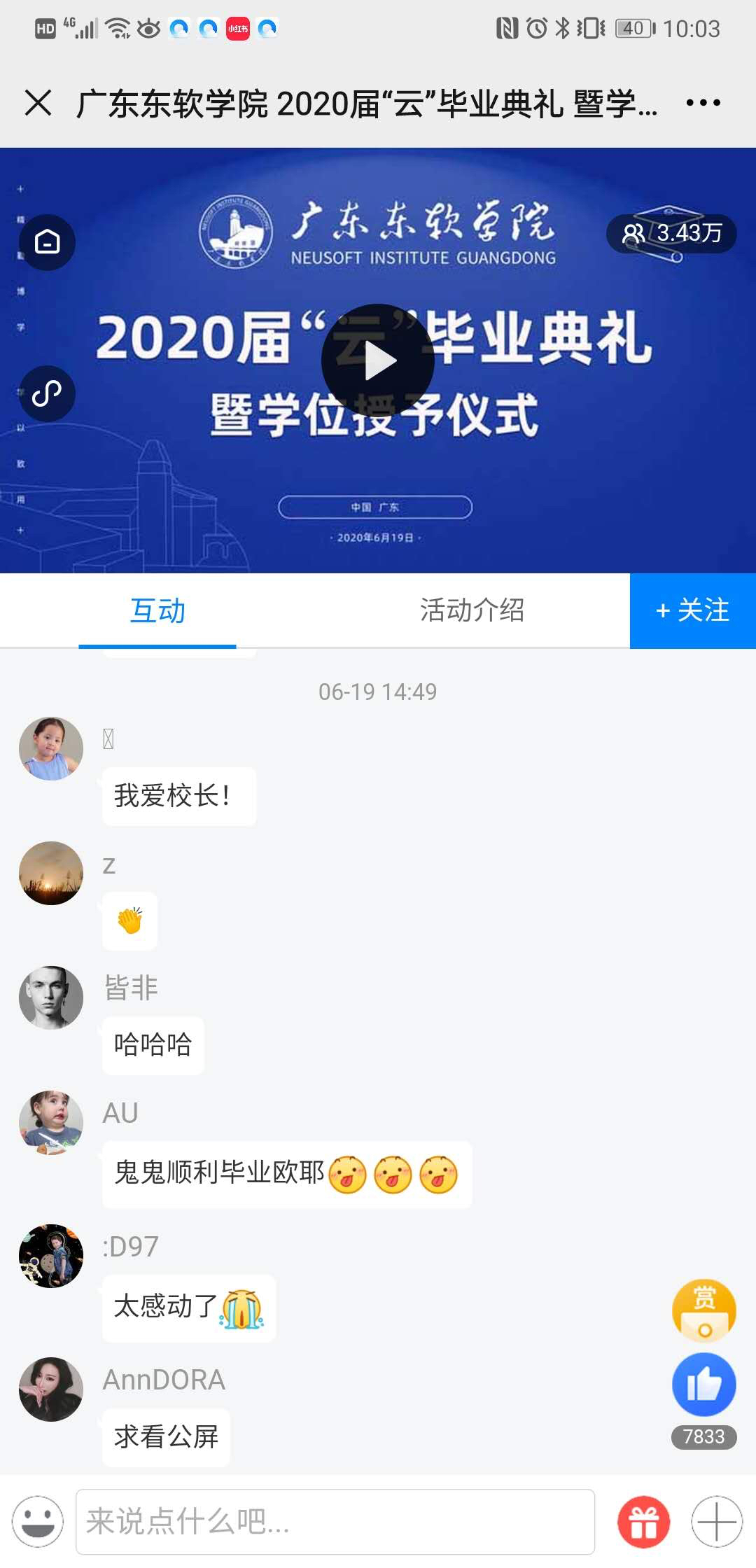 记者了解到,在这场“云”毕业礼上,除了表白校长、表白即将离开的校园,不少学生还化身“追星粉丝”,疯狂点赞作为学生代表发言的该校外国语学院2020届毕业生何柳斌。