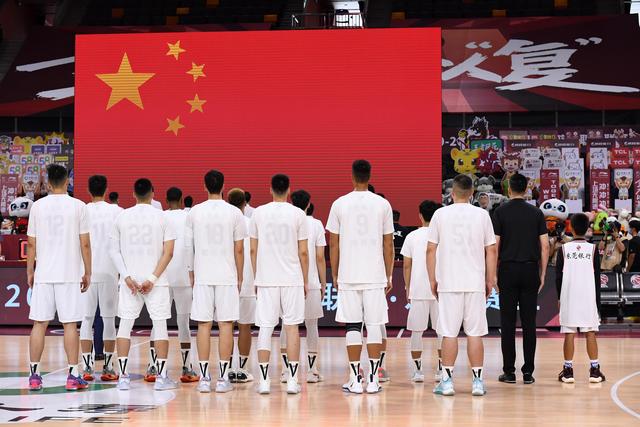 ↑6月20日,独臂篮球少年张家城(右一)在比赛前和广东东莞银行队成员一起唱国歌。