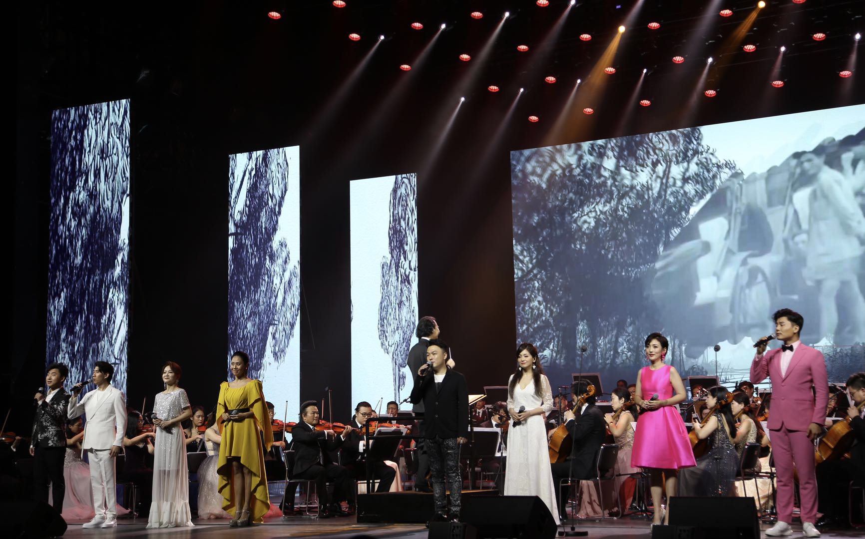 在第一篇章中,电影音乐联奏《我的祖国》《花儿为什么这样红》《弹起我心爱的土琵琶》,熟悉的音乐以及舞台上大屏展现的电影影像资料,让观众回到了激情燃烧的岁月。由宋雪莱演唱的歌曲《想往》,则致敬了抗疫英雄不畏艰险、不畏生死、舍小家为大家的精神。