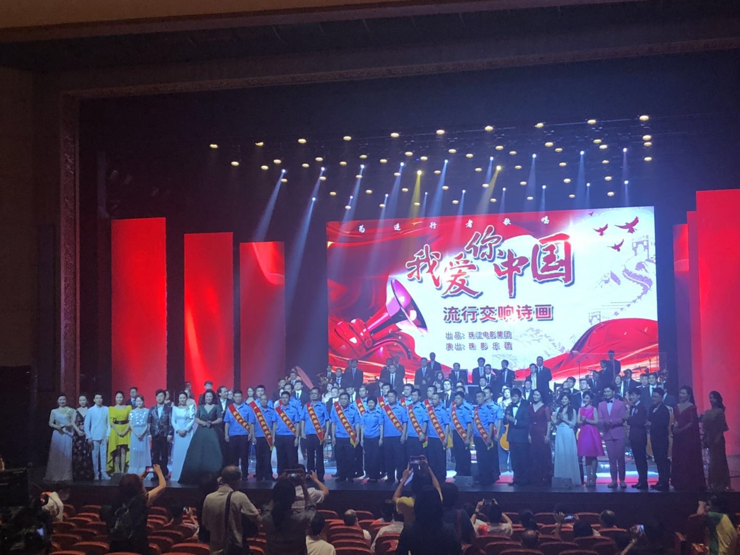 当晚,随着稚嫰童声的演唱,演出在人们熟悉的主题音乐演奏《我爱你中国》中拉开帷幕。演出分为三个篇章,每一篇章的诗朗颂,均有主题音乐演奏《我爱你中国》,并由中国戏剧梅花奖得主王虹、中国话剧最高奖金狮奖得主张琳进行朗诵。主体音乐演奏由珠影乐团管弦乐团、流行乐团共同承担。著名指挥家、作曲家、国家一级指挥、珠影乐团常任指挥侯丹平担任指挥。